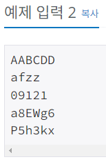 총 다섯줄의 입력이 주어진다. 각 줄에는 최소 1개, 최대 15개의 글자들이 빈칸 없이 연속으로 주어진다. 주어지는 글자는 영어 대문자 ‘A’부터 ‘Z’, 영어 소문자 ‘a’부터 ‘z’, 숫자 ‘0’부터 ‘9’ 중 하나이다. 각 줄의 시작과 마지막에 빈칸은 없다.